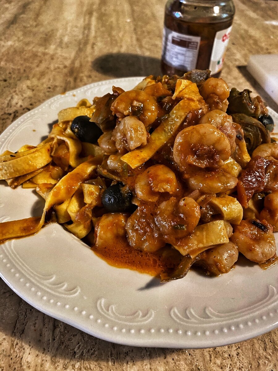 Первоначальная идея пасты была - артишок, лук, чеснок, оливки, креветки и томатный соус. Артишок очищается обжаривается с луком, затем тушиться 10 минут отдельно с небольшим количеством воды. Затем добавляется томатный соус, оливки, чеснок и тушатся ещё минут пять. И по сути, последним этапам должен идти креветки и практически готовая паста.
