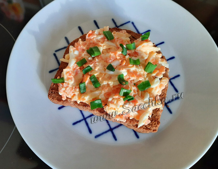 Вообще, изначально я это ела в гостях не как намазку на бутерброды, а как самостоятельный салат. Только вместо обычного сыра там был плавленый, а вместо сметаны с горчицей - майонез. Я пробовала разные сочетания, но с варёной морковью вкуснее всего.
