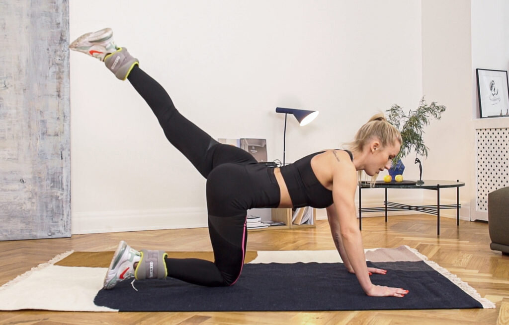 Каждое упражнение выполняйте по 15 раз, затем отдых 2 минуты и заново повторите весь комплекс. Всего 3 круга. Юлия использовала утяжелители, но новички могут работать только со своим весом.