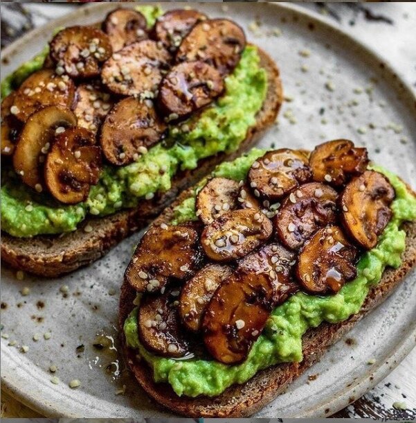 6️⃣ Толстым слоем намажьте авокадо и выложите грибы.