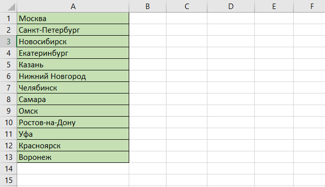 Составьте в отдельном месте вертикальный список значений, из которого пользователи в дальнейшем смогут выбирать необходимый вариант значения в ячейке. В качестве примера создадим список основных крупных городов России.
