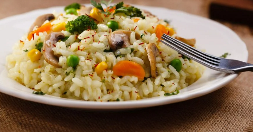 5.Добавляем в сковороду рис перемешиваем заливаем бульоном и тушим на среднем огне до готовности.