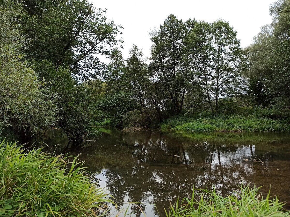 Следуя вдоль левого берега вверх течения Тарусы вскоре мы окажемся на поле. По сбегающим к реке тропинкам и потом полевой дороге добираемся до окрестностей Ильинского омута. Здесь над рекой склоняются ветви больших деревьев: