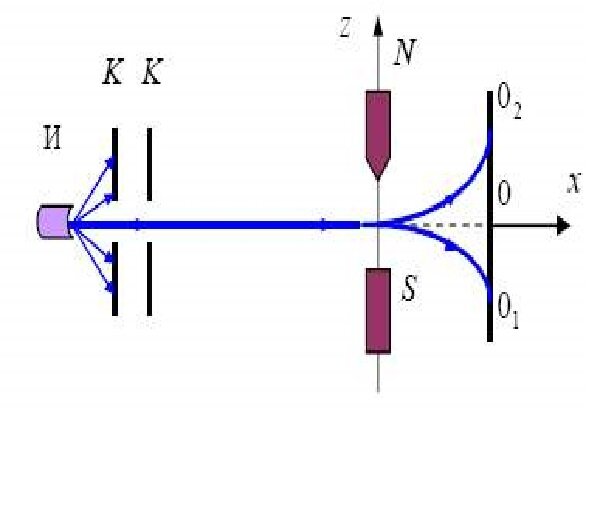 В первой пучок пролетает между заостренным и плоским наконечниками магнита.