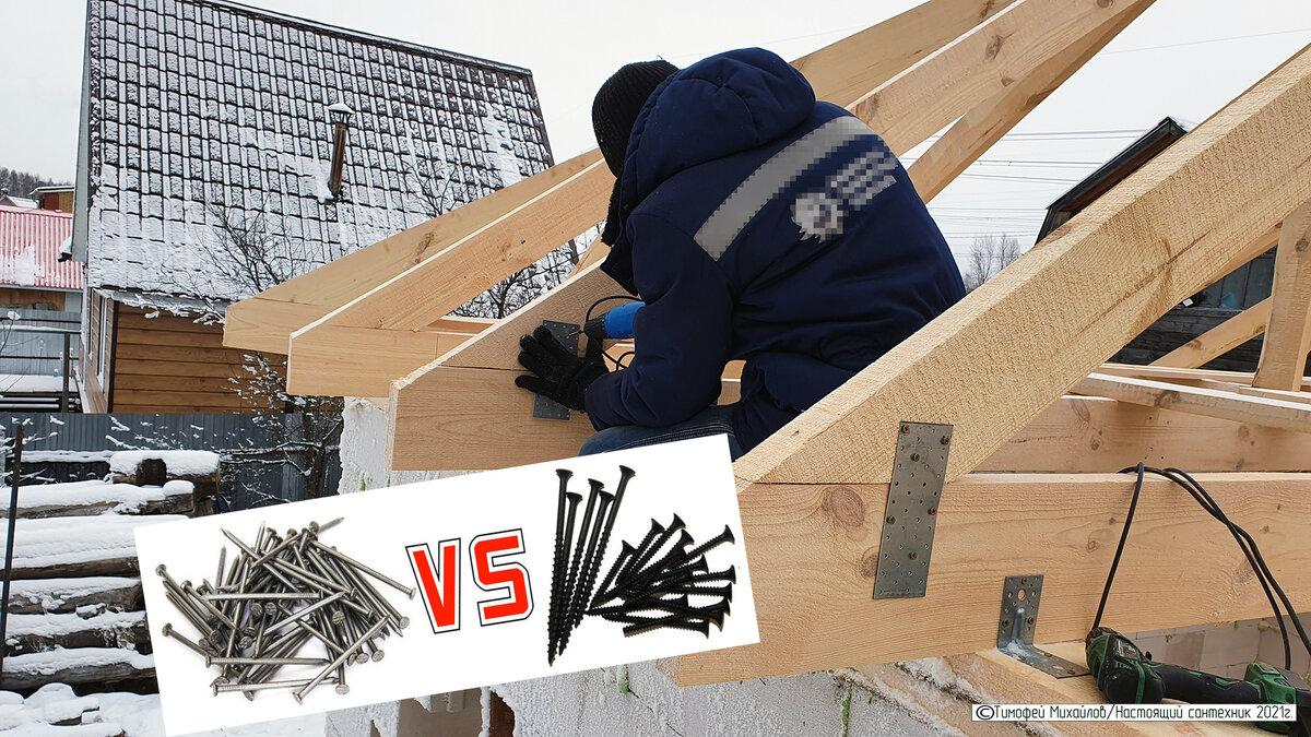 Кровельщики собрали мою крышу на саморезы и металлические пластину. Гвозди так же применялись при сборе ответственных конструкций.