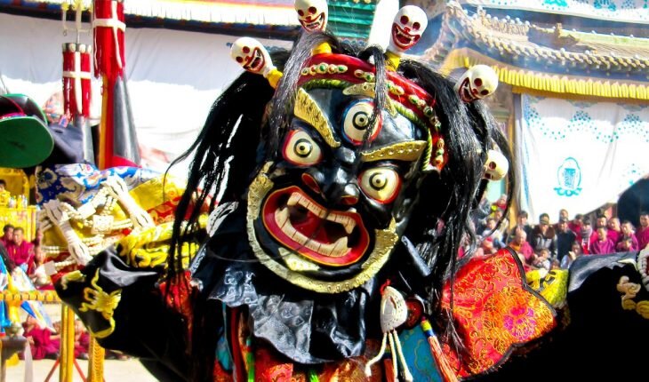 В этой связи маска слегка наклонена назад, что производит странный эффект — как будто все персонажи, танцуя, пристально вглядываются в небо. Перед использованием маска должна быть освящена. Лама читает соответствующие молитвы, бросая зерна освященного риса. Маски, особенно те, что передаются из поколения в поколение, считаются священными реликвиями, обладающими магическими свойствами.