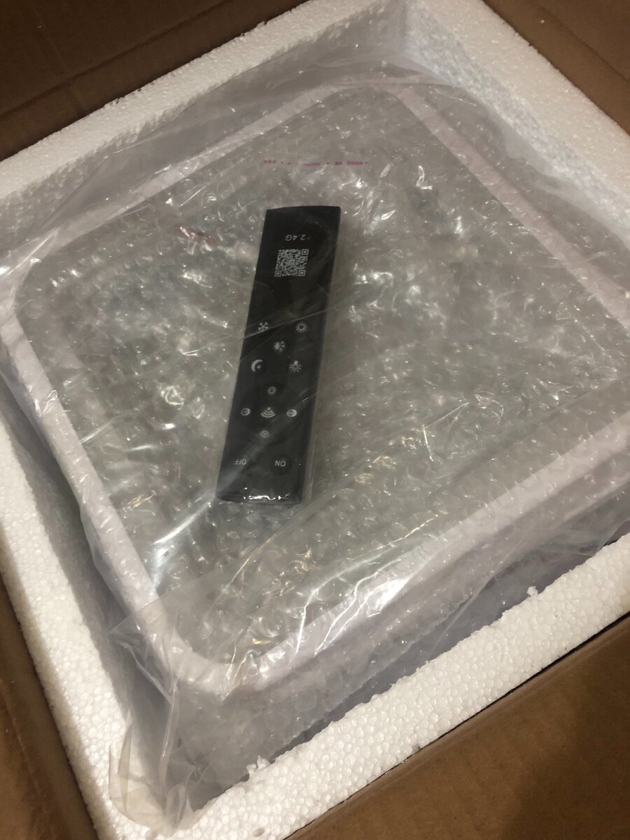 Вот такой комплект был. Небольшая коробочка, в ней люстра, комплектующие, инструкция, пульт.