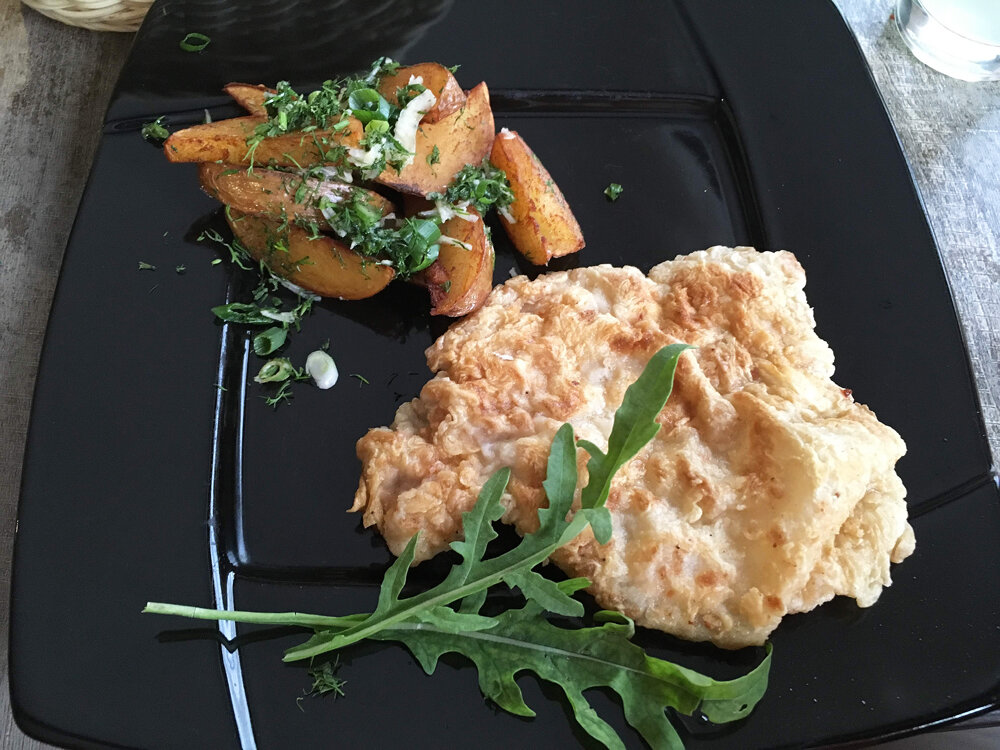 И сегодня мы перенесёмся в в довольно известный посёлок Массандра, который находится рядом с Ялтой и славится своим винзаводом. Именно на винзавод мы и направлялись, если честно. Но по пути решили перекусить в местном кафе со звучным названием Палкивилки. Кафе очень приличное. Вот, например, рыба в панировке, если память мне не изменяет.
