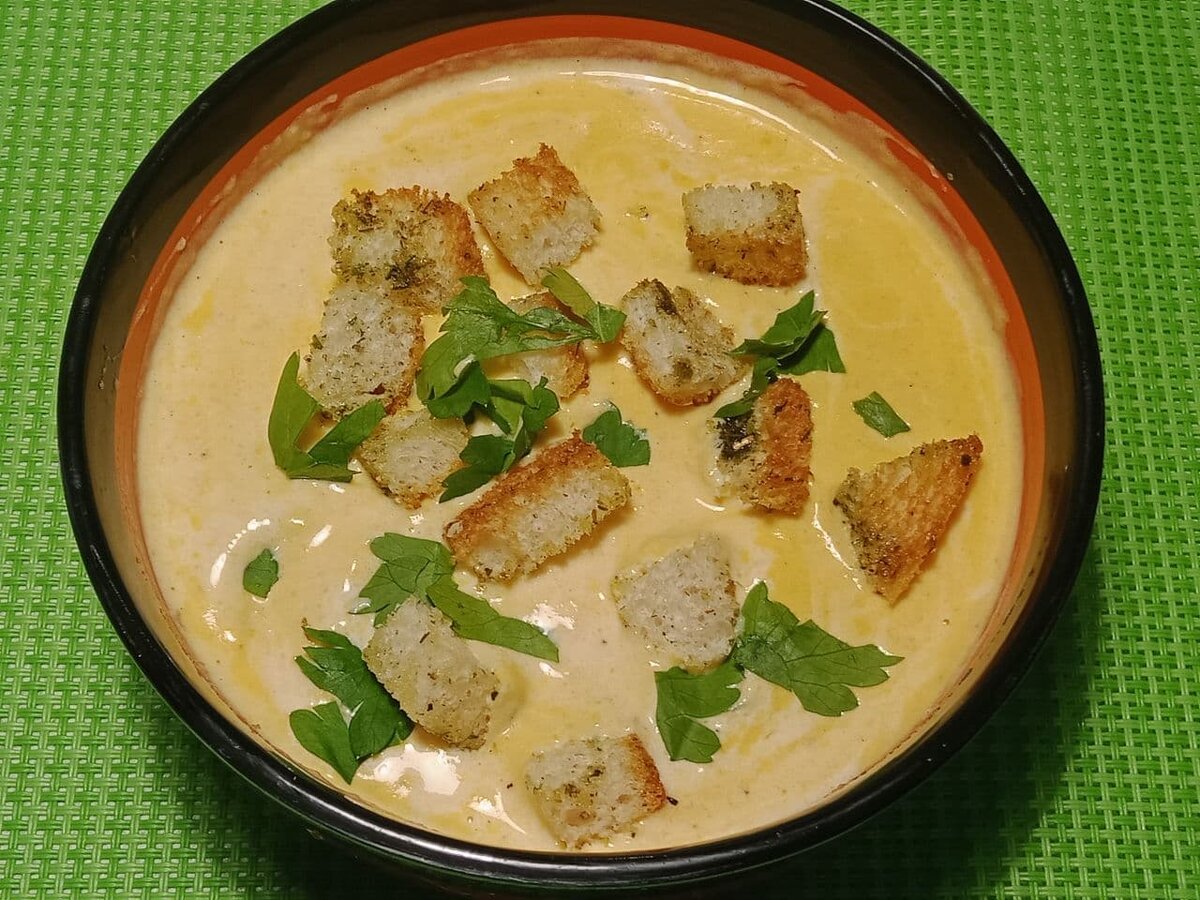 Наливаем суп в тарелку украшаем чесночными сухариками и зеленью.