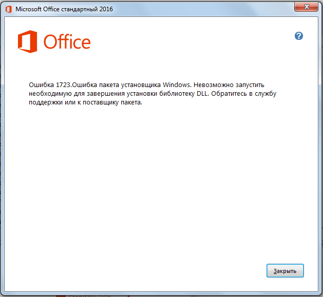 Бывает такое, что при установке пакета Microsoft Office выходит ошибка следующего содержания: "Ошибка 1723. Ошибка пакета установщика Windows. Невозможно запустить необходимую для завершения установки библиотеку DLL. Обратитесь в службу поддержки или к поставщику пакета" .