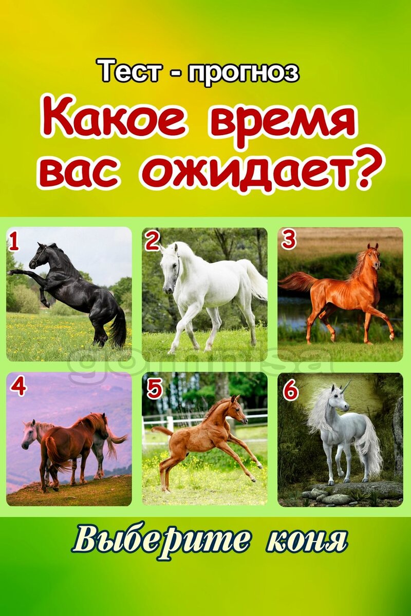 Тест прогноз – Какое время вас ожидает. Что за период у Вас на пороге? К чему нужно подготовится? Что можно скорректировать? И что нельзя изменить? Доверьтесь своей интуиции. Пройдите быстрый тест и узнайте. Посмотрите на иллюстрацию. Выберите символ пути – коня, который Вам нравится больше остальных предложенных. Прочитайте значение Вашего выбора.
