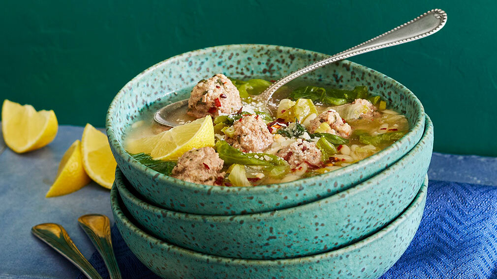Перелейте бульон в большую кастрюлю на сильном огне. При закипании опускаем фрикадельки. Добавьте эскарол, цедру лимона и орзо. Дождитесь закипания убавьте огонь до среднего. Готовьте при медленном кипении в течение 10 минут или пока орзо не станет мягким, часто помешивая. Подавать посыпать сыром.