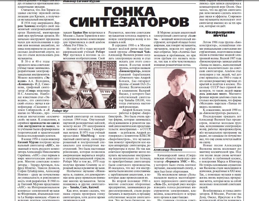 В новом номере газеты "Аргументы недели" вышла статья Владимира Марочкина "Гонка синтезаторов" - о парадоксальном соперничестве СССР с Западом в синтезаторостроительстве, о котором как-то особо и не упоминается. А зря - очень много интересных инструментов было разработано и запущено в производство в Союзе. И пусть к середине 80-х годов по некоторым функциям наши синтезаторы уступали западным, но