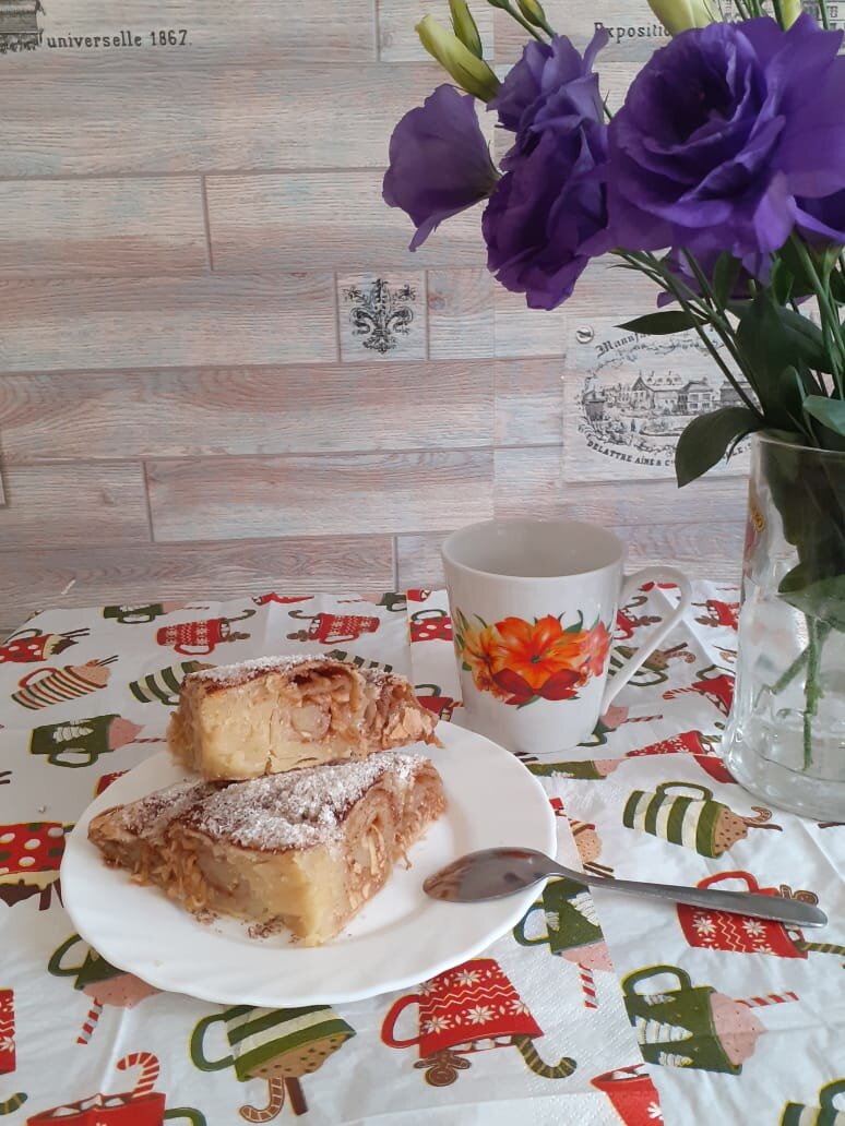 Вертута-это рулет из пресного вытяжного теста с начинкой. Секрет вкуса вертуты заключается в тонкости теста. Начинка бывает разной, я хочу поделиться вертутой с яблоками и корицей.