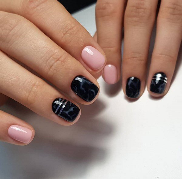 Ненавязчивый и стильный мраморный узор на ногтях в короткой длине будет как всегда восхитителен. Специалисты рекомендуют создавать отдельные акцентные пальчики с мраморным узором в коротком дизайне ногтей, дополняя их полосками фольги и другими элементами для получения шикарного мраморного маникюра на короткие ногти 2021-2022.