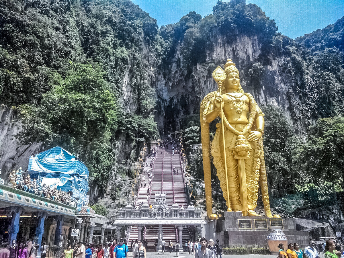 По прибытии в столицу Малайзии город Куала-Лумпур мне, как спелеологу, хотелось увидеть в первую очередь пещеры Бату. Местные дали пещере два названия: Храмовая, - из-за нескольких индуистских обителей внутри и Светлая - из-за огромного отверстия в потолке, откуда проникает дневное освещение. Плюс там же находится самая большая в мире статуя Муругана - покровителя воров. Вот так!