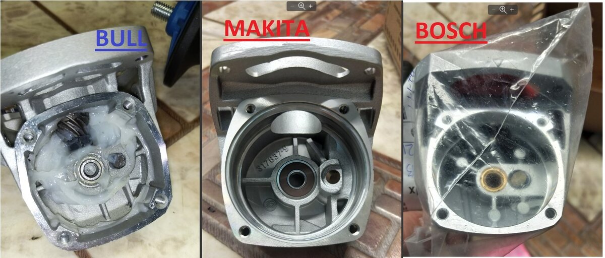 Литья такого качества металла у нас раньше однозначно не было среди китайских УШМок. Редуктор имеет множество ребер жесткости, толщина стенок на уровне брендов, сопрягаемые поверхности фрезерованы. Толщина стенки вокруг штока стопора более чем достаточная. Все очень достойно. При сравнении с вортексом становится понятно где китайцы экономят на бюджетках. Это толщина стенок, кол-во ребер, меньше этапов механической обработки. Нижний опорный подшипник – шариковый, как у Макиты. Это гуд.