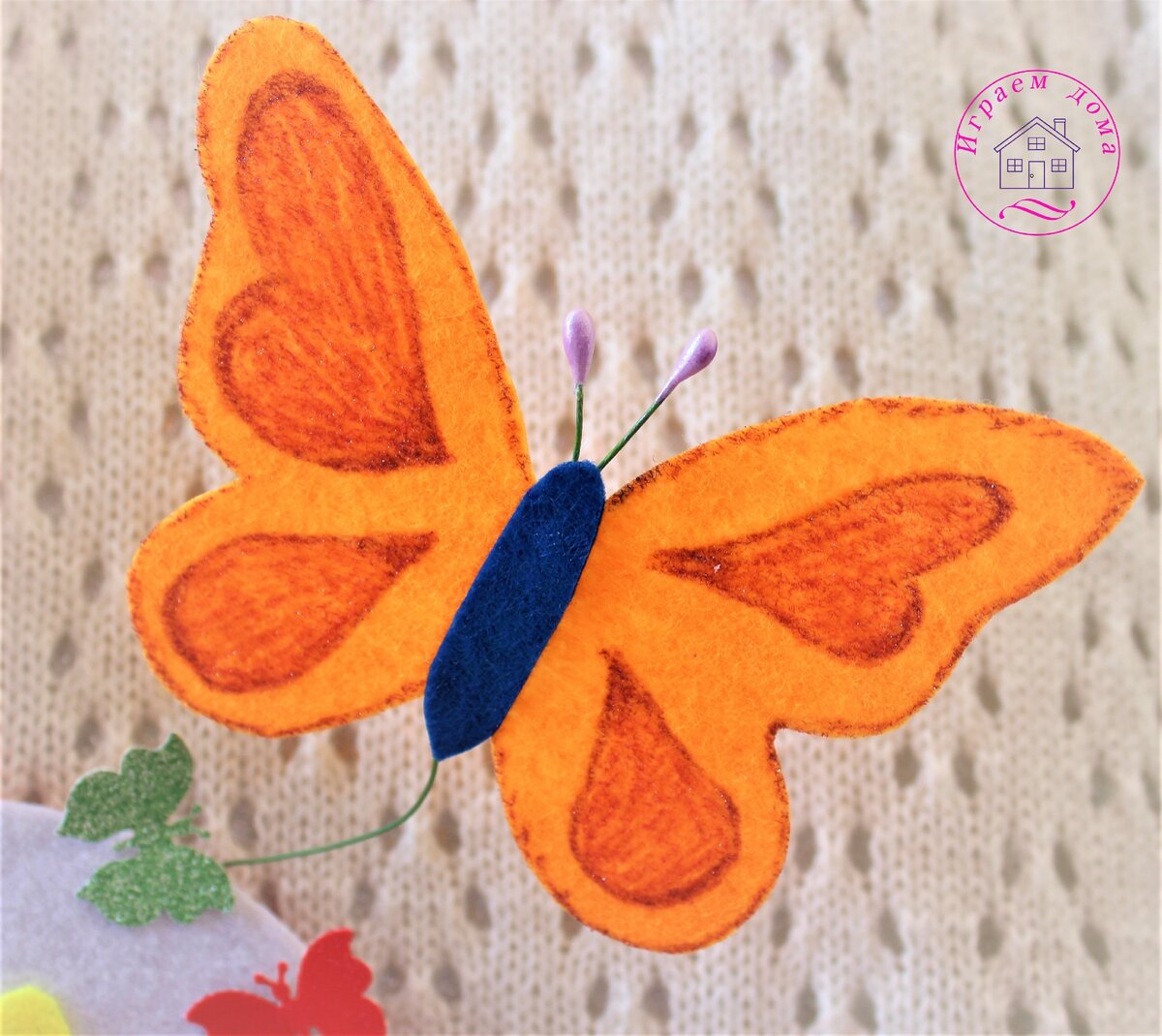 Бабочкам делаем из тычинок усики. Вырезаем из фетра другого цвета - тельце. Приклеиваем. Так не будет видно место крепление усиков.