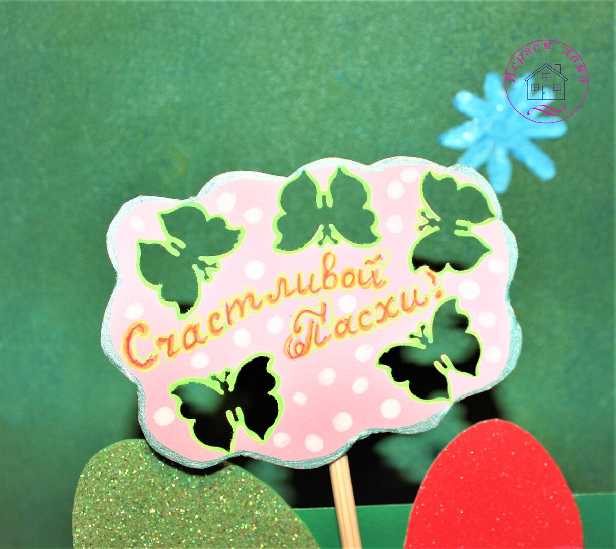 Из шпажки и скрап бумаги делаем табличку с праздничной надписью. Верхушку картона украшаем яйцами из фоамирана.