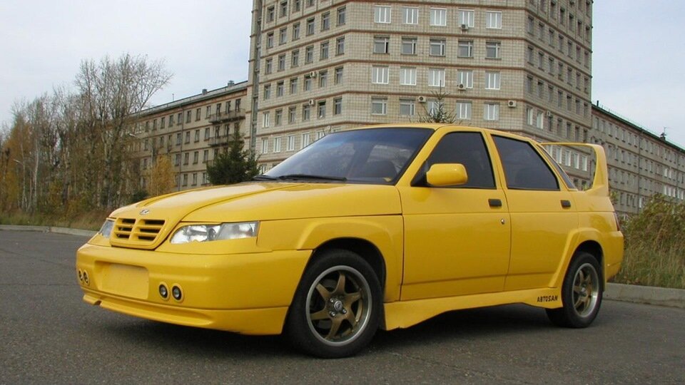 На видео машина представляет собой “десятку” чёрного цвета, обклеенную различными белыми наклейками, полосами, и надписями. Салон авто