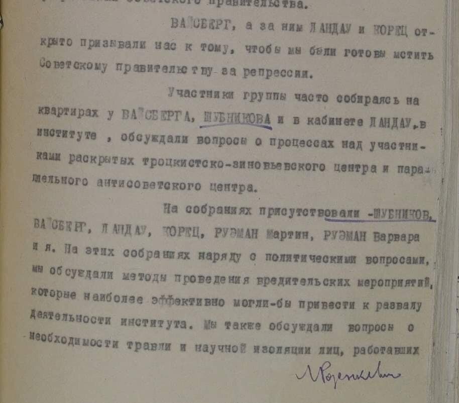 Наряду с этим ШУБНИКОВ, при помощи участников организации - ЛАНДАУ и КОРЕЦА, путем провокации и травли, выжили из криогенной лаборатории старшего научного работника РЯБИНИНА, который занимался разрешением практических задач по вопросу о получении новых видов топлива для двигателей внутреннего сгорания. Доведенный да отчаяния РЯБИНИН избил ЛАНДАУ и в связи с этим вынужден был совсем уйти из института.
