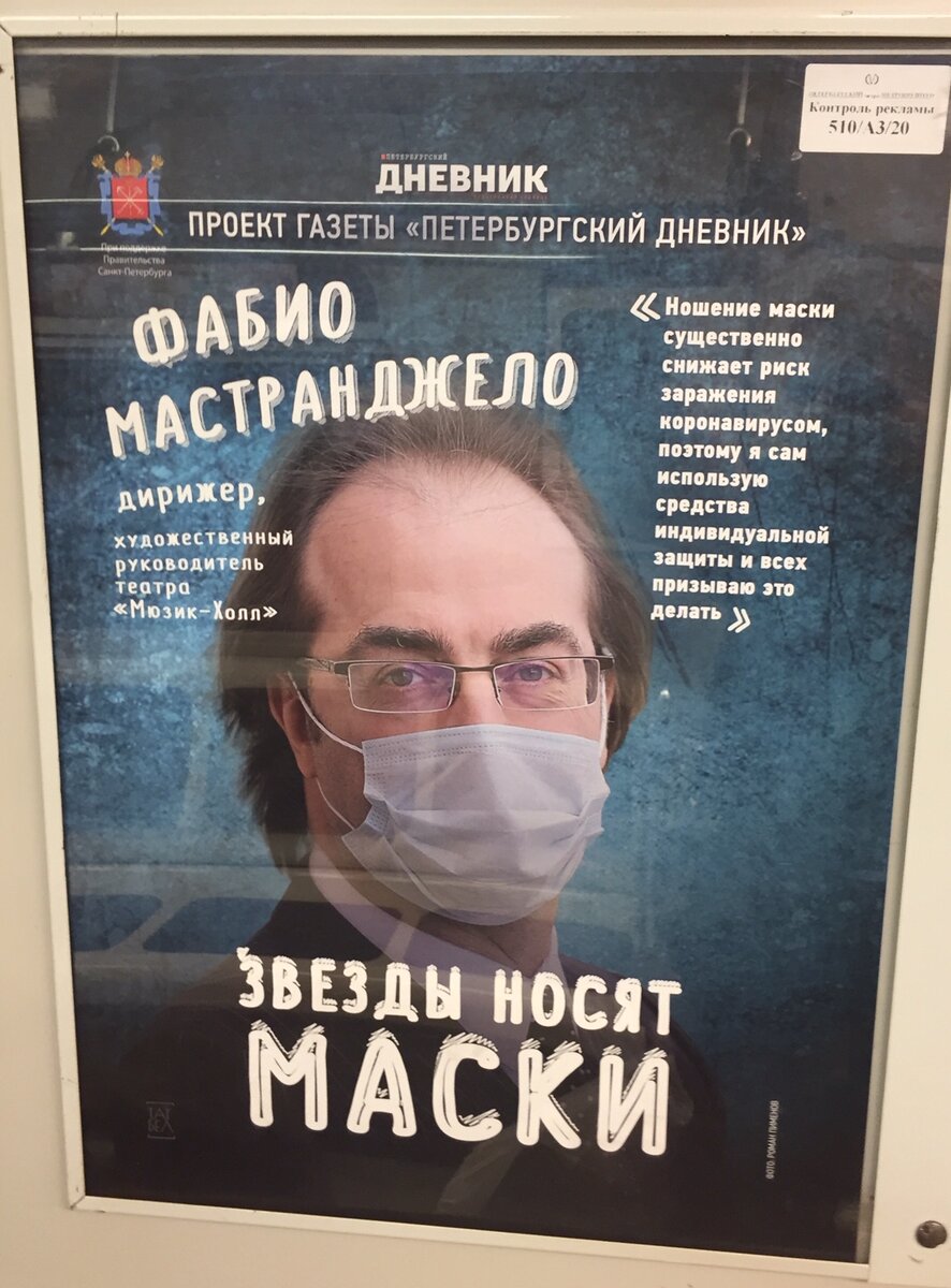 В Питере уже давно висит разная «социальная» реклама по поводу борьбы с пандемией коронавируса. Одна из них, которую часто видел в метро зимой — «Звёзды носят маски». Сейчас встречаю её уже реже. Странно, но «звезды», на ней изображённые, явно не слишком известны большинству людей: дирижеры, режиссёры... Вот так она выглядит: Недавно появилась новая «антиковидная» реклама, вроде с более известными людьми и слоганом «Я сделал прививку от коронавируса. А Вы?» Пока вижу её редко, только с актёром Машковым и только на остановках наземного транспорта. Вообще вся эта реклама какая-то «блеклая», не подвигающая общество к мобилизации в обстановке общей угрозы. Модель на такой рекламе почти без эмоций смотрит в кадр. Возможно, была идея выразить таким образом спокойствие и уверенность в себе при ношении маски или после прививки. Но в целом как-то невыразительно получилось. Не знаю какие у всего этого были бюджеты, но кадры среди «рекламщиков» были найдены, на мой взгляд, не высшего уровня. Что