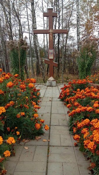 Дорога к пансионату лежит через лес. Вокруг ни души. Посреди леса стоит красивый православный крест. К нему всегда можно подойти и помолиться.
