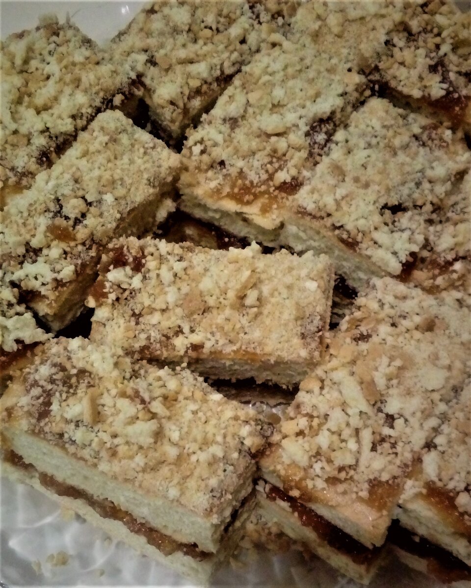 Готовый корж разделить пополам. Смазать повидлом одну половину. Накрыть второй половиной и тоже смазать повидлом. Можно посыпать рублеными грецкими орехами. Я обрезала края коржа и сделала крошку, которой посыпала верх пирожных.