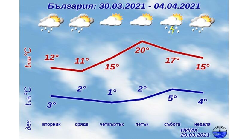 Сегодня будет переменная облачность с умеренным северо-западным ветром. Максимальная температура будет между 12° и 17°...К концу недели температура в Болгарии повысится до 20°