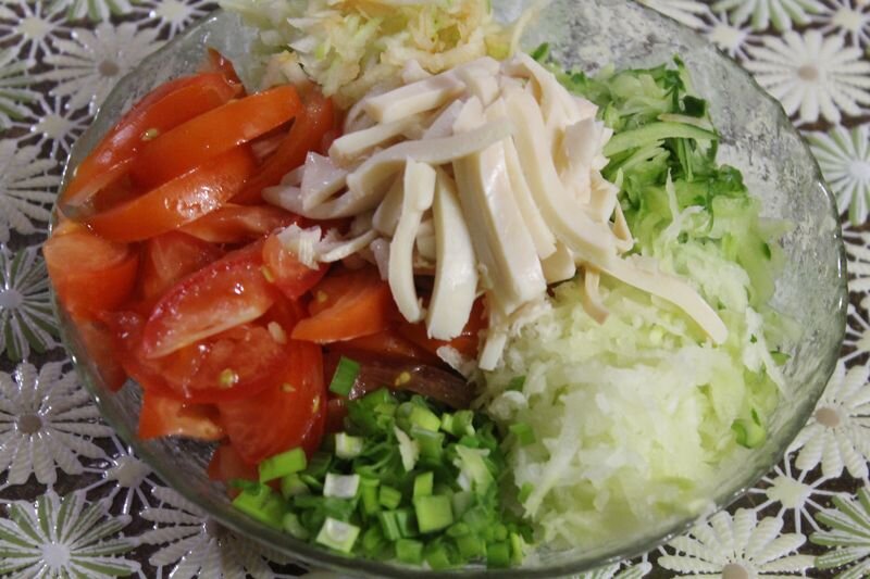 Вчера залезли в холодильник в поисках еды, нашли группу овощей и парочку кальмаров, мерзнущих в вечной мерзлоте морозилки. Откопали, отогрели, отмыли и приготовили салат с кальмарами для которого у нас с собой было: