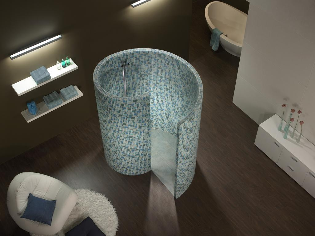 Один из оригинальных вариантов - распложенные посреди помещения кабины в основанием виде спирали, эллипса, круга. Они могут быть из прозрачных и непрозрачных материалов, цветные и нейтральные, с подсветкой и без. Конечно, места для такого решения нужно немало - подобную кабину не "загонишь в угол" для экономии пространства.