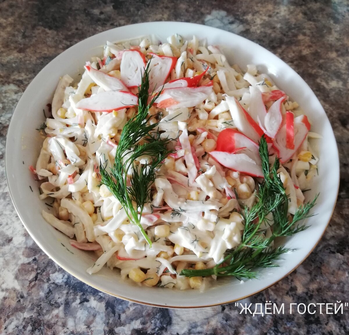 С крабовыми палочками, яйцом, солёными огурцами и кукурузой.