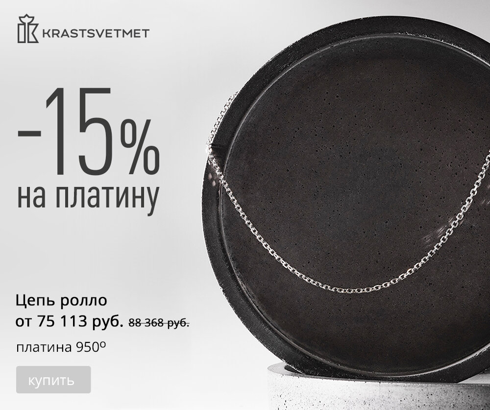 С 15 марта по 12 апреля скидка 15% на все цепи, браслеты и крестики из платины.