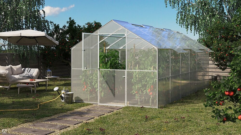 Поликарбонат покупают для возведения всесезонных конструкций. Материал намного легче стекла и в разы плотнее пленки. А если рассматривать сотовый вариант, то прибавится еще и хорошее сохранение тепла. Поэтому именно из сотового поликарбоната можно купить сборную теплицу с готовой комплектацией.
