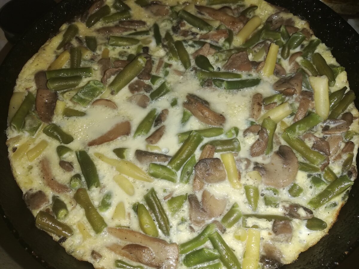 Разогреть на сковороде раст.масло, обжарить грибы, минут через 5 добавить к ним фасоль, размешать, залить яйцами и накрыть крышкой, на маленьком огне до готовности.