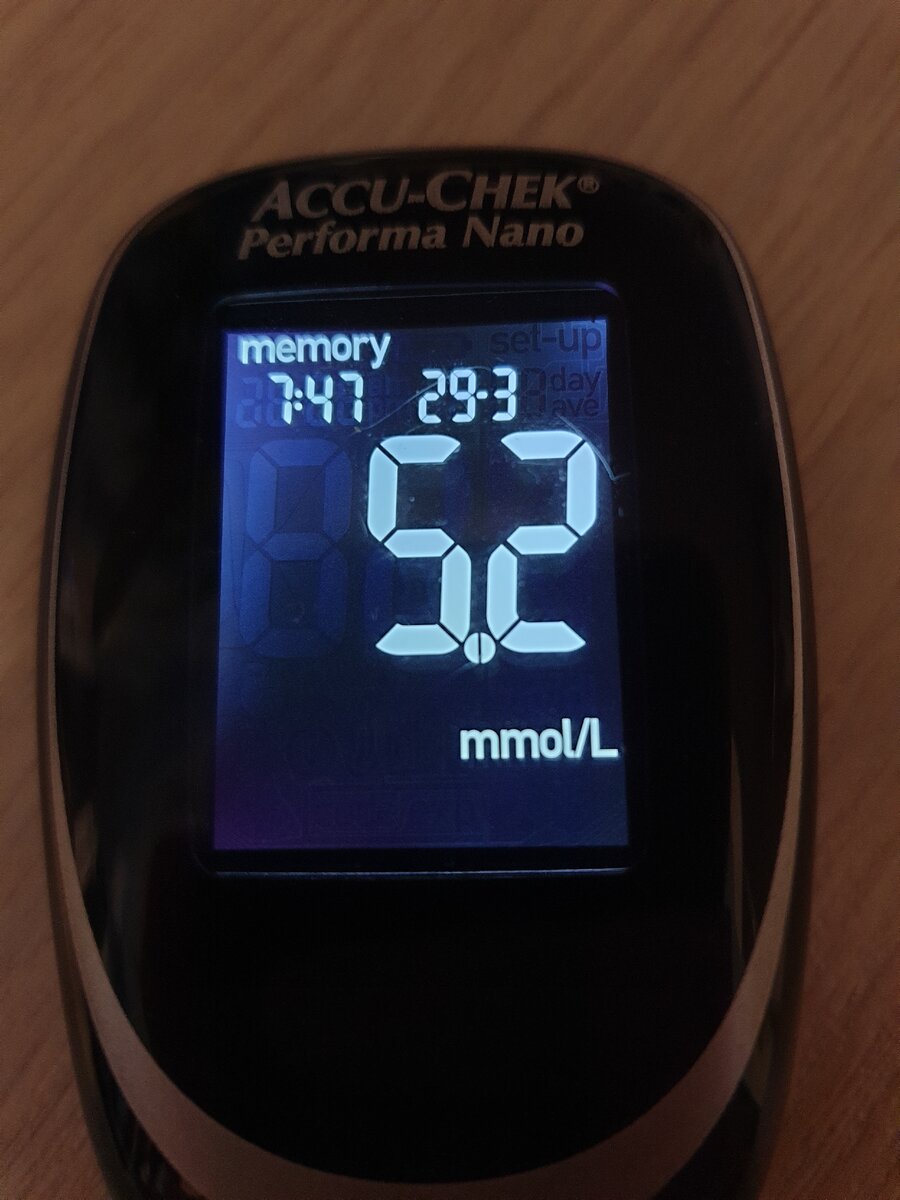Сегодня утром я проснулся с сахаром 5,2 ммоль/л. На завтрак я съел бутерброд с сосиской и выпел чашку кофе. В бутерброде я посчитал только кусок хлеба на 1 ХЕ. Кофе я пил приготовленное кофе машиной без сахара, добавил только немного молока. Завтрак у меня получился на 1 ХЕ. На завтрак я поставил 2 единицы короткого инсулина. Через 30 минут после приёма пищи сахар поднялся до 7,2 ммоль/л.