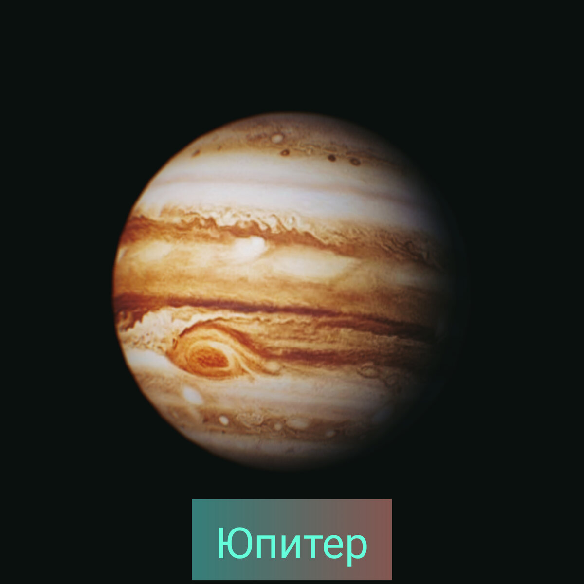 Юпитер состоит главным образом из водорода, одна четвертая от массы - гелий, он также может иметь каменное ядро из более тяжелых элементов. Внешняя атмосфера планеты явно делится на несколько полос в разных широтах, а в результате волнений и бурь их границы взаимодействуют. Известный результат - Большое Красное Пятно, гигантский шторм, который, как известно, существует по меньшей мере с семнадцатого века, когда он был впервые увиден с помощью телескопа. Планету окружает кольцо с мощной магнитосферой. Есть также не менее 63 спутников, в том числе 4 большие луны, называемые галилеевыми спутниками, которые впервые были обнаружены Галилео Галилеем в 1610 году. Ганимед, самый крупный из этих спутников, имеет диаметр больше, чем у Меркурия; среди других Европа и Каллисто.