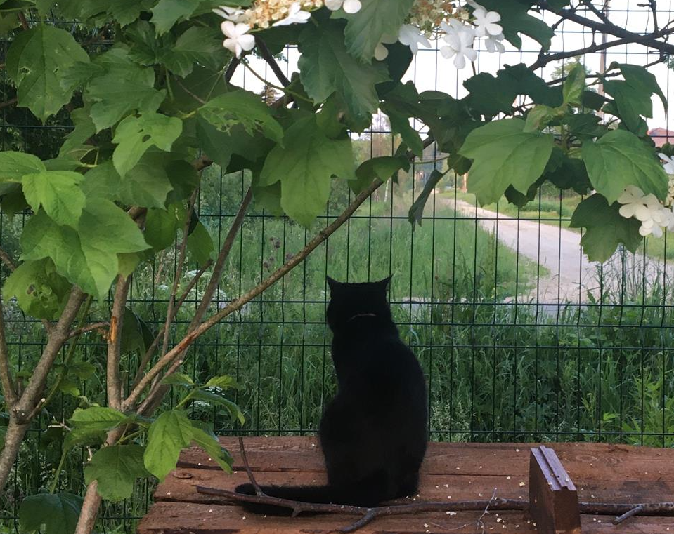 «Машины нет, Игорь, наверное, уехал в город. Дверь закрыта, значит все спят. Посижу на скамейке, погреюсь на солнышке», - подумала мудрая кошка Нора.