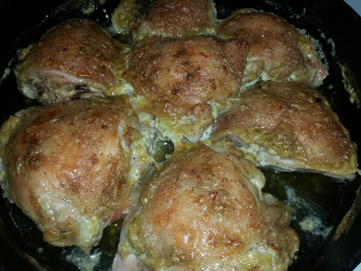 Куриные бедрышки (у меня было 7 штук) промыть, обсушить бумажной салфеткой, посолить обычной крупной солью (примерно 1 десертную ложку), добавить черный молотый перец (примерно 1 ч.л.), выдавить через пресс 1 головку чеснока, 2-3 ст.л. майонеза - всё перемешать и оставить мариноваться минимум на 1 час, а лучше на ночь.... Выложить бедрышки в емкость для запекания вместе с соусом, в котором