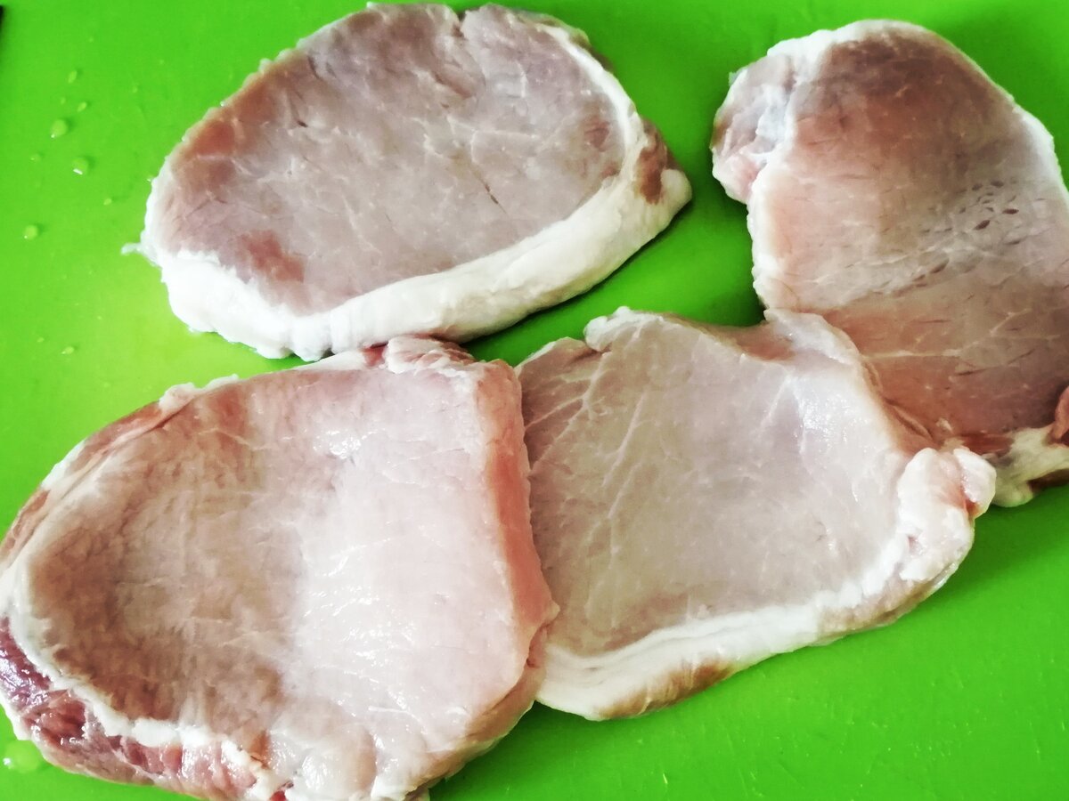 1. Свинину следует промыть водой, нарезать на средние порционные кусочки, немного поперчить или посыпать любимой приправой, отбить молотком до мягкости. Кстати, можно и не отбивать, будет всё равно сочно и вкусно. Но мне кажется, когда с мясом поработает молоток, то оно становится ещё нежнее после приготовления.