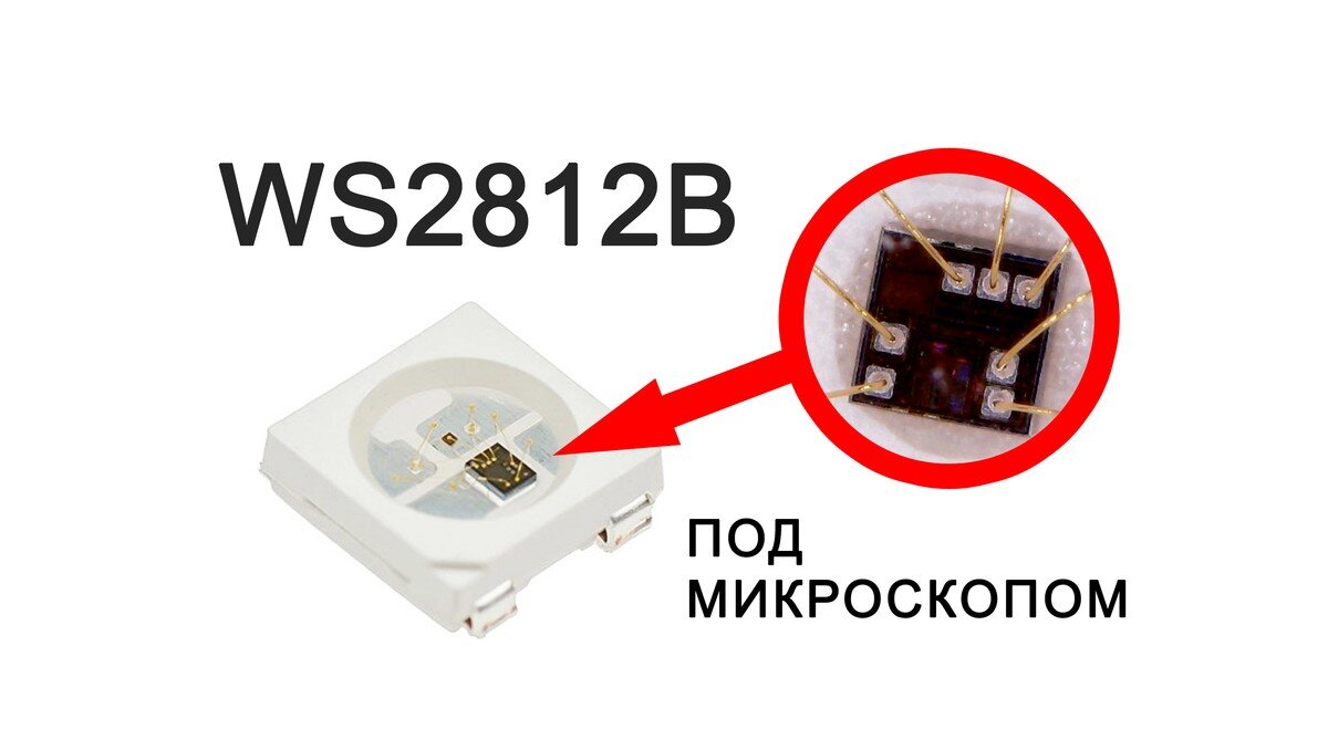 Если взглянуть на адресный светодиод под микроскопом , то хорошо виден сам контроллер светодиода и идущие от него нити, тоньше человеческого волоса к каждому из встроенных светодиодов.