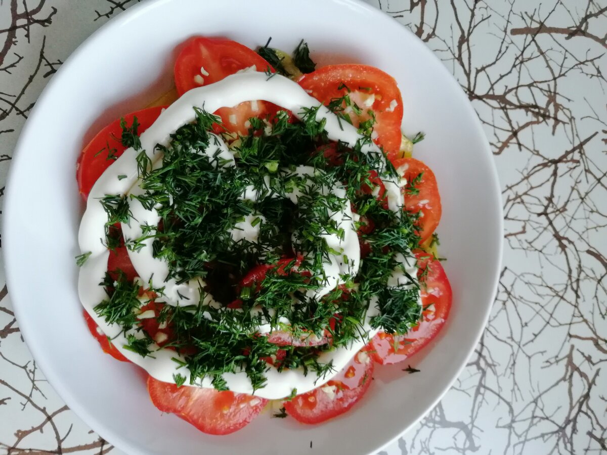 Кабачки, помидору нарезаем слайсами (кругляшами), чеснок и укроп измельчаем.