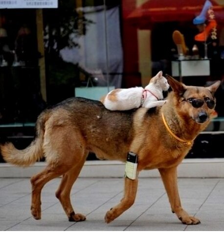 В провинции Юньнань, все знают двух неразлучных друзей – собаку и кота, которые настолько обожают друг друга, что не просто проводят все время вместе – кот в прямом смысле слова словно всадник восседает на своем четвероногом друге. Собака не только не против такого «наездника», она сама опускается на четвереньки, чтобы котенку было удобней залазить ей на спину.Поражает то, что животных такому