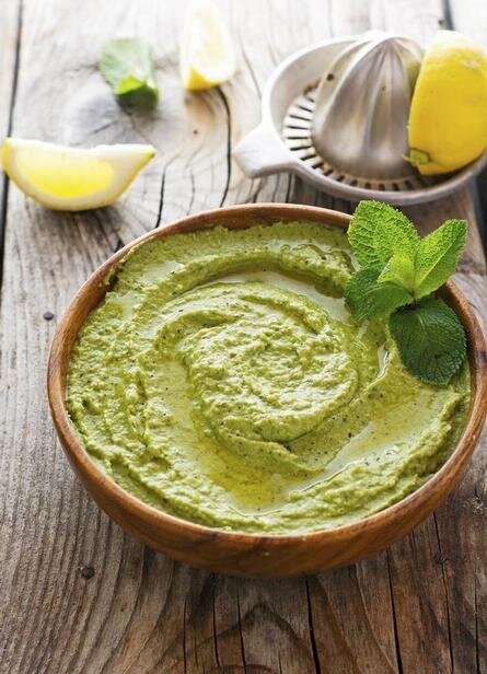 - В блендере смешать горошек, цедру, пармезан, цедру и сок лимона, мяту, оливковое масло.