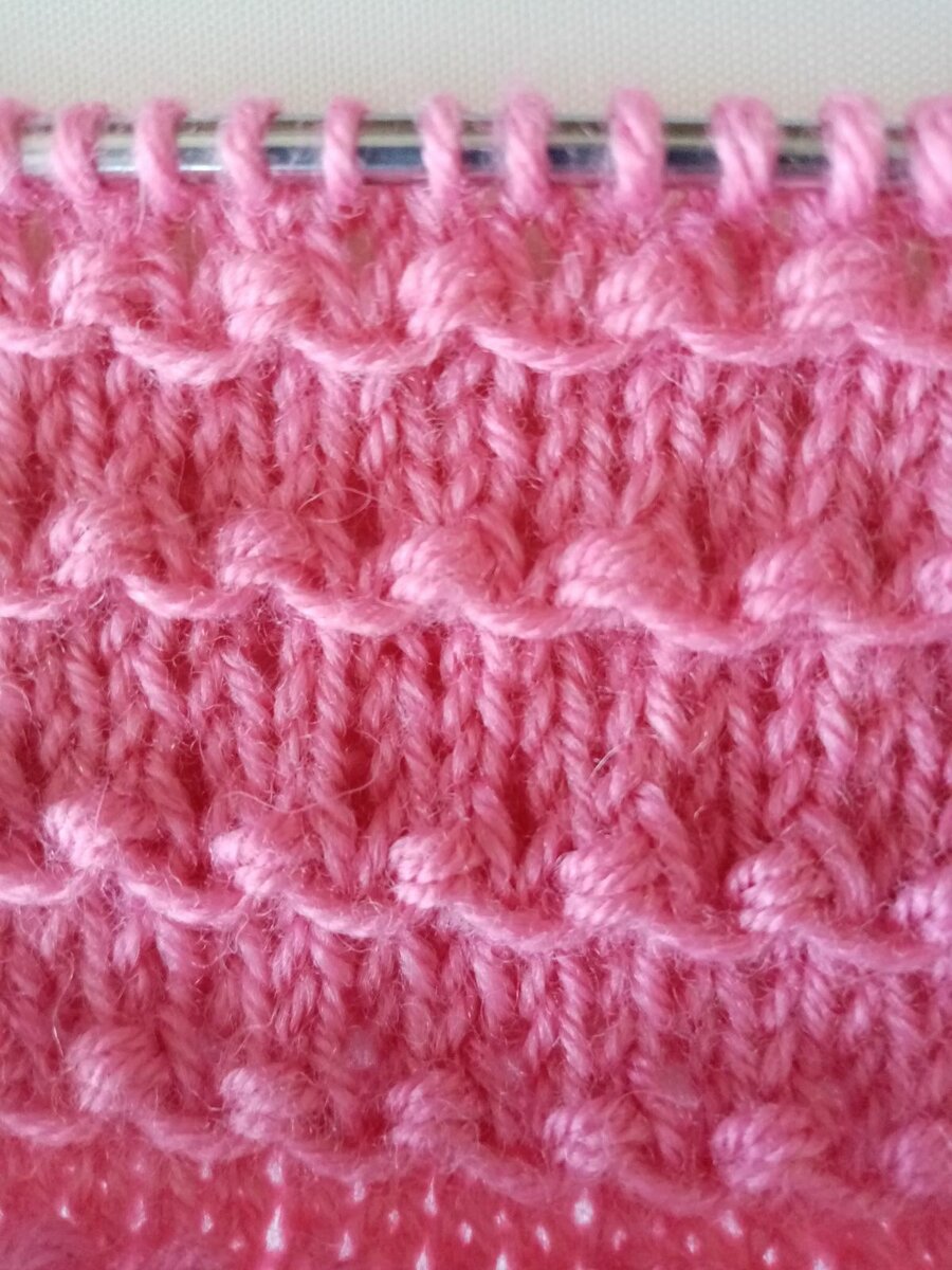Красивый несложный узор с объемными узелками. Подходит для вязания шапок, детских изделий.