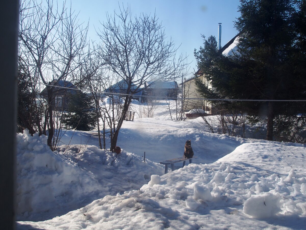 У нас тут на днях так растеплило, что мы с Шурой самонадеянно поработали на улице в легких кофточках. Не прошло и двух дней, как оба слегли с простудой и с тоской глядим теперь на болтающуюся за окошком Дуську. А она и рада стараться - разве что язык нам не кажет!