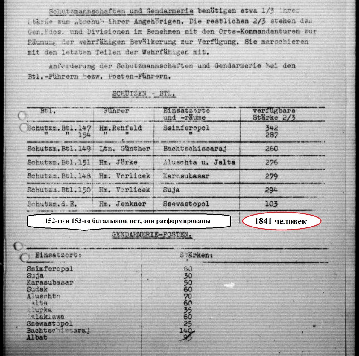 По поводу перевода 152-го батальона для охраны «концлагеря "Красный"»… Приведите мне хоть один документ (но, только документ противника со ссылкой на архив). По тем документам «Главнокомандования Крымом», что есть у меня, батальон сторожит Джанкойский узел железной дороги и ж/д Джанкой-Керчь. И, еще, в дулаге 241, он же (у нас) концлагерь «Красный», содержится … чуть более 200 человек. В бараке, отданном «СД» 53 человека: пленных вывезли, перевели в Шталаг 370 (в отделения в Симферополе и Севастополе), партизанское и подпольное движение в Крыму почти ликвидировано. Держать 200 человек для охраны 200 заключенных? В Симферополе, кроме этого были 147-й и 154-й батальоны. Смысл загонять сюда абсолютно ненадежный 152-й батальон? Почему ненадежный? Да, потому, что он сформирован был из жителей Джанкойского района, которые даже изначально не питали симпатий к врагу. (об этом писал даже А.В.Мокроусов в 1942 году). Если глянуть в немецкие документы, то, несмотря на то, что осенью 1942 года из Крыма убывает 836-й ландсшутц батальон, а в январе 1943 года убывает 49-й вах-батальон (конвойный батальон), Главнокомандование Крымом формирует отдельную НЕМЕЦКУЮ конвойную роту (без номера), а «СД» к этому времени формирует свою охрану «своего» барака. Внешняя охрана Дулага – армейская, внутри – отдельная охрана «спецзона». Так пока получается по немецким документам. Ладно, читаем дальше.