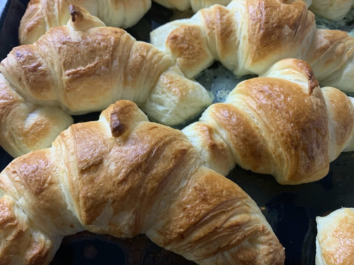 🔹когда круассаны увеличились в размере, смазывать их смесью из желтка, сливок и сухарной пудры