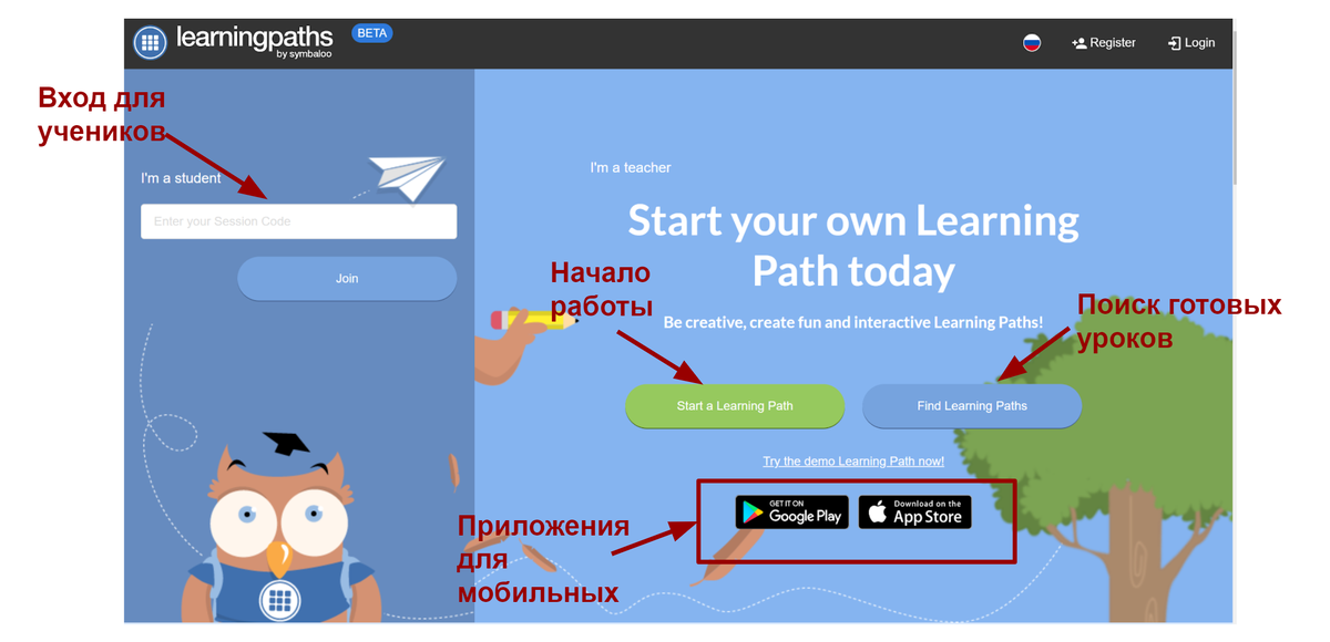 Для создания цифрового урока необходима регистрация в сервисе Simbaloo. Это можно сделать с помощью аккаунта социальных сетей или с использование адреса электронной почты. Перейдите на Symbaloo Learning Paths и нажмите кнопку Register bkb Start a Learning Paths