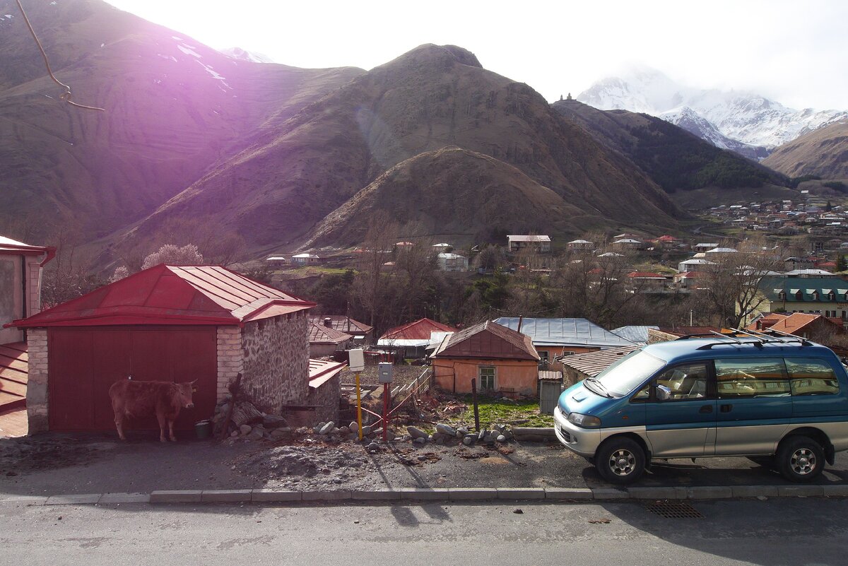 Поездка наша пришлась на конец апреля, и погода пока не спешила баловать теплом. Да ещё и гора Казбег, высотою в 5000 метров, диктует тут свои законы. Местные утверждают, что когда над горой идёт снег, то здесь, у подножия, тепла ждать не стоит.